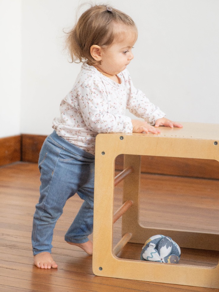 Las caras con barrotes sirven como apoyo cuando se empiezan a parar, ya que tienen la dimensión adecuada para que la manito se pueda sostener con seguridad y practicar pararse y volver al suelo. Cuando empiezan a caminar, el techo tiene la altura perfecta para que pueda servir de apoyo, y luego los barrotes sirven de escalera para trepar!!!