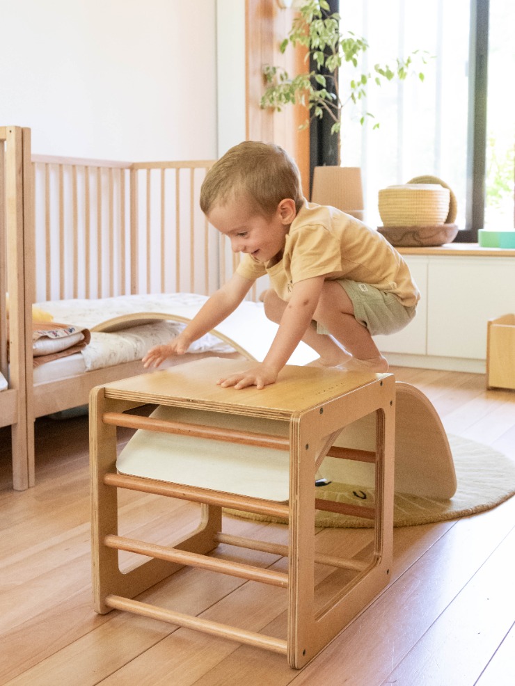 Las caras diáfanas (huecos y barrotes), permiten una interacción social (interacción visual, intercambio de objetos) entre el niño que está “adentro” y un compañero de juego que está “afuera” de la estructura. Define arriba y abajo, crea un techo que baja la escala a la de un niño haciendo que este perciba las diferentes alturas (la del Cubo Pikler y la de la habitación).